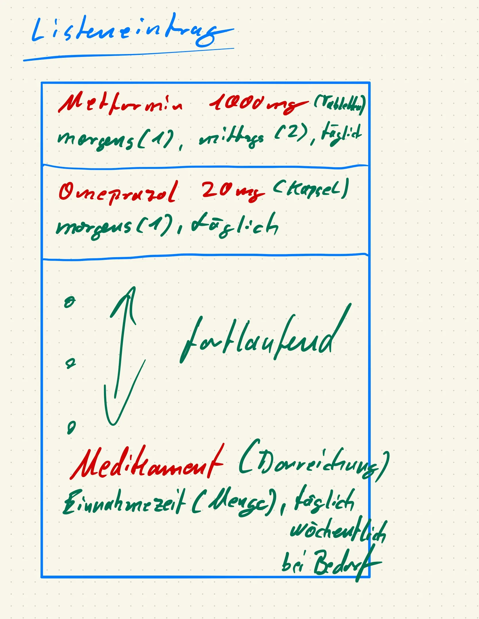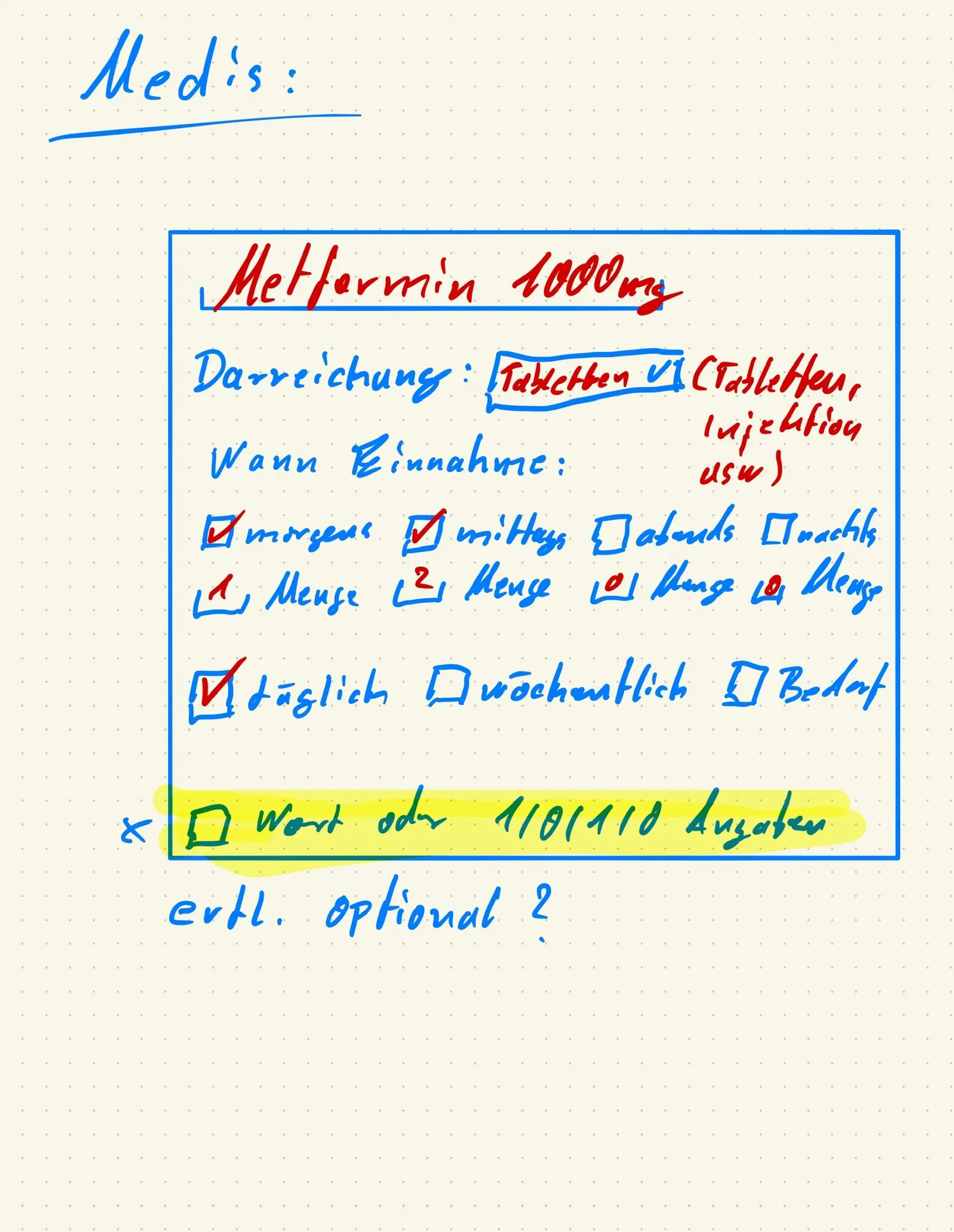 ich habe mir nochmals ein paar Gedanken zur Neugestaltung der Medikamenteneingabe gemacht. Nachfolgend habe ich mir mal zwei Notizen gemacht. Einmal zur Eingabeform und einmal zur Auflistung. Was meint ihr? Fehlt noch etwas?