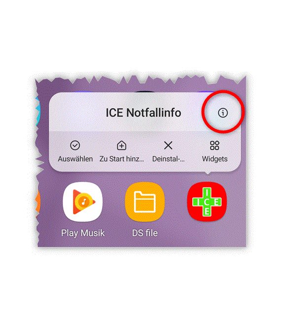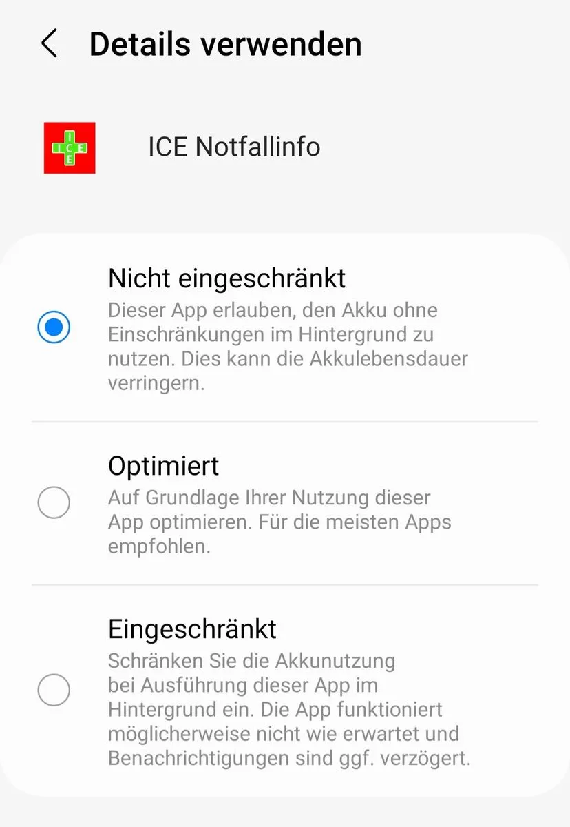 Einstellungen > Apps > ICE Notfallinfo > Akku >